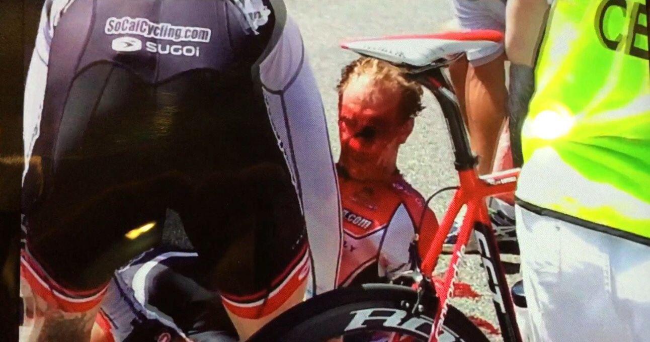 While in the final sprint of this pro cycling race, Ronnie collided with a barrier and consequently, shattered every bone between his eyes and jaw. He also fractured his left orbital bone; lacerated his left eyelid; broke several teeth, and least notably (dark humor) fractured his right arm in three places.